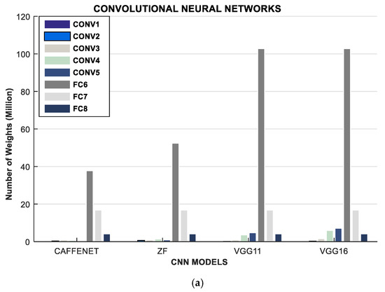 CNNs are a class of neural networks that are suitable for computer vision applications, object recognition applications, etc. [114,115,116]. In ConvNets, key features in an image are extracted then converted into complex representations using the pooling layer, and subsequently, the fully-connected layers classify the image and identify the image appropriately. The CNN architecture is primarily made up of a large portion of convolution layers, followed by few fully connected layers. Some CNNs sometimes add pooling and normalization layers in-between the convolution and fully connected layers. The presence of convolution layers that perform kernel functions (vector-matrix multiplications) makes CNNs very computation-intensive and less memory-hungry due to the few fully connected layers. Therefore, optimizations for CNN models concern more computer-centric directions such as innovative hardware acceleration developments, processor technology, tiling, and data reuse, reduced precision, quantization, etc. Popular CNNs are ResNets, LeNets, AlexNets, GoogLeNets, VGGNets, etc. The computation and memory requirements of some CNN models are given in Figure 2 and summarized in Table 10.