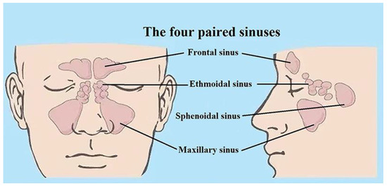 The sinuses, which surround the nasal cavity, are gas-filled cavities located in the facial bones and the skull. The mucosa of the nasal cavity continues into the sinuses. This explains why infection of the nasal cavity can cause infection of the sinuses [8]. There are four pairs of paranasal sinuses: the maxillary, the frontal, the ethmoid, and the sphenoid ones, as shown in Figure 1 [9]. They are air-filled, mucosa-lined cavities within the maxillofacial region and skull, and all are communicating with the nasal cavity [10,11]. Sinuses are divided into two groups according to their anatomical location and the opening locations of the sinus connecting passages (the ostia). The anterior sinuses are the frontal and the maxillary cavities, all with openings to the middle nasal passage [10,11]. The posterior group of sinuses consists of the sphenoid and the ethmoid sinuses. The former ones open in the sphenoid recess and the latter ones open in the upper nasal passage. The maxillary sinuses are the largest ones [10]. The average volume of the adult maxillary sinus is 10–15 mL. The ethmoid sinus is a honeycomb-like structure within the ethmoid bone, and consists of 3–18 cells. The frontal sinuses are located within the frontal bone. The frontal sinus opening is located at the bottom of the cavity and is funnel-shaped, connecting with the middle nasal passage [12]. Within the sphenoid sinus, there is a septum separating the left and right cavities. All paranasal sinuses are lined with epithelial cells and the connecting passages to the nasal cavity serve for ventilation and transport of mucus. Healthy sinuses are characterized by unimpeded ventilation and normal function of cilia in mucus transport. In the case of viral or bacterial infection, the mucosal tissue becomes swollen, mucus secretion increases, the cilia function becomes impaired, and the nasal passage is partially or completely blocked, which might result in rhinosinusitis [13]. Judged by clinical symptoms, it is difficult to distinguish between viral sinusitis and bacterial sinusitis. Many junior doctors tend to think that sinusitis is an acute bacterial infection, and in 85% to 98% of the cases antibiotics are prescribed [1]. However, in 84% to 91% of the cases the infection is of viral origin [14,15,16]. Even if it is caused by bacteria, the condition disappears in most patients following anti-congestion medication and without antibiotic treatment. The overuse of antibiotics, which has attracted widespread attention, has led to an alarming increase in bacterial antibiotic resistance and medical costs [17,18,19]. It has been estimated that half of the antibiotics use in human medicine is unnecessary, as the infections are caused by viruses [20,21], and the use of antibiotics then only results in resistance development, which is growing rapidly worldwide, especially in Asia, including China, where 25–50% of people carry multidrug-resistant or methicillin-resistant bacteria [22,23,24,25]. A situation, foreseen already in 1945 by the father of antibiotics, Alexander Fleming, is thus quickly developing, possibly constituting a larger threat to humanity than climate change and most pandemics.