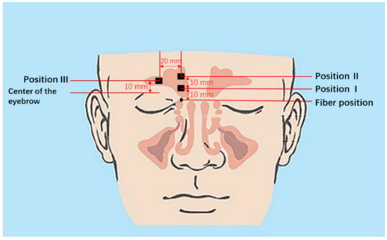 In order to find optimum sinus signals, the detector was put in different positions to observe the strength of the signal (Figure 2). The light emitting fiber was positioned at the base of the nose and emitted the laser vertically upwards as seen in Figure 2. Based on exploratory measurements, it was decided to choose three different measurement geometries: the detector 10 mm above the light source (Position I), 20 mm above the light source (Position II), and 10 mm above the center of the eyebrow (Position III), as shown in Figure 2. A signal sampling time of 2 s was chosen and 30 sets of data at each marked position were recorded.