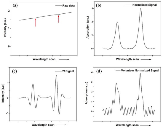 Figure 4b shows the two absorption lines isolated after subtracting a fitted background. It is well-known that 1/f noise can effectively be suppressed by operating at a high frequency f. In wavelength modulation spectroscopy [36], employed in our earlier studies [33,34,35,37,38], the wavelength was modulated appropriately to generate a derivative-shaped signal due to the absorptive imprint. Frequently, the second derivative is used in the signal evaluation. In contrast, direct absorption monitoring was employed in the present work, still with good performance. Figure 4c displays the second derivative of the data shown in Figure 4b, to provide a connection to the earlier work. Finally, Figure 4d shows a typical recording of oxygen from a sinus cavity.