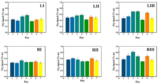 Data in Figure 5 show measurement results for a first volunteer as recorded at the six chosen locations during one week (seven consecutive days), marked with bars of different color. The data in the figures are given in six sequences, each for the same time span starting with the I, II and III locations for the left frontal sinus, followed by the I, II and III locations for the right frontal sinus. The recorded %*m values from the instruments are plotted with one standard deviation of the 30 consecutive recordings, each lasting 2 s.