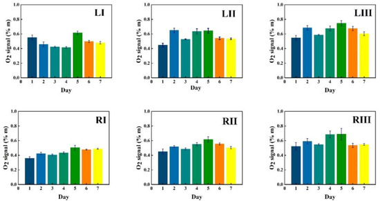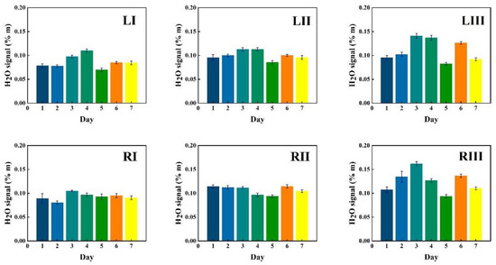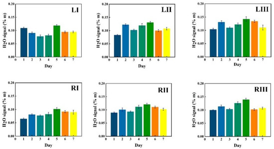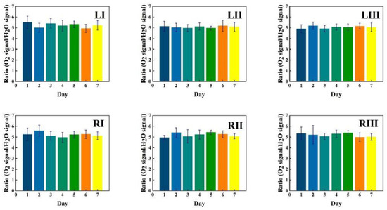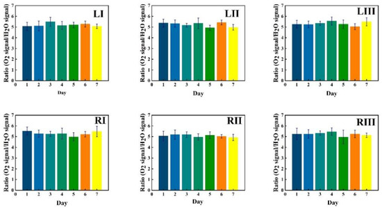 Corresponding data for water vapor are shown in Figure 6, while the ratio of the oxygen and water vapor results (from Figure 5 and Figure 6, respectively) is plotted in Figure 7. Day-to-day variations in both gas signals are moderate, and believed to reflect slightly varying mucus fillings. Recorded differences between different locations are persistent over time for both gases. With minor deviations, it is observed that for both gases, the signals increase until day 3–4, then exhibit a minimum for day 5, again to rise day 6 and fall back day 7. The average signal value going from location I to II, and I to III increases persistently and reflects the longer pathway in gas when injection-detection distance is increased. The oxygen/water vapor ratio data, which according to Equation (2) are proportional to the oxygen concentration, are closely similar for all locations and over time, reflecting that the behavior is the same for oxygen and water vapor.