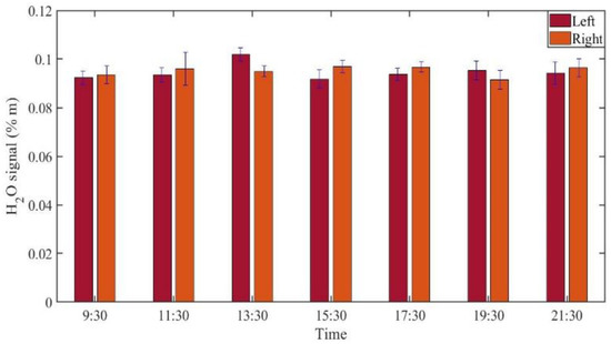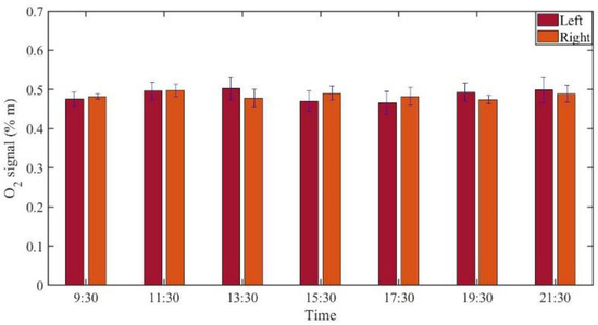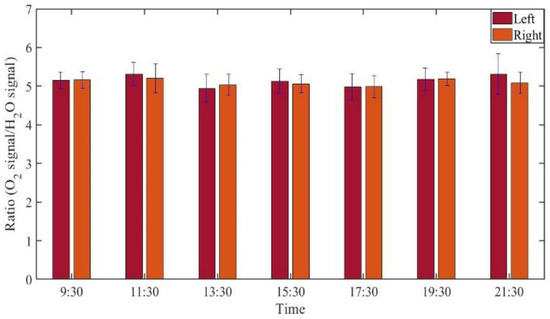 GASMAS data might change somewhat from day to day, e.g., because of different filling with mucus and possible slow changes in health status. Such trends are observed in the data given in Figure 5, Figure 6, Figure 7, Figure 8, Figure 9 and Figure 10. In order to further assess the instrumental and methodological stability and reproducibility of the GASMAS technique applied in sinus monitoring, it was also considered valuable to follow the signals during a single day. For this study on volunteer 1, only one position was chosen, at the left and right sides of the face. Gas signals from the sinuses of this volunteer were measured every two hours throughout the day, starting at 9:30 a.m. and ending at 9:30 p.m. Data for oxygen, water vapor and evaluated ratio are given with one standard deviation in Figure 11, Figure 12 and Figure 13.