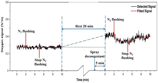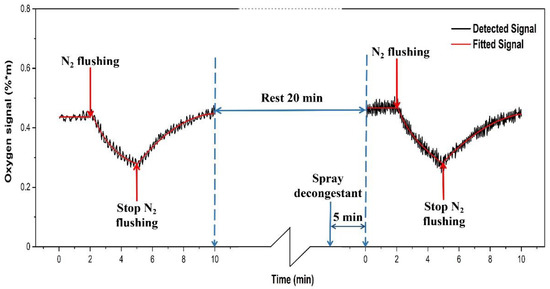 After the end of the first part of the study, the healthy volunteer was asked to rest for 20 min. At the 15th minute, decongestant was sprayed into the left nostril of the volunteer. After 5 min of action, the second part of the study was conducted, and again lasted for 10 min. For 60 recordings (2 min), the background oxygen level was recorded for the same frontal sinus of the volunteer after spraying decongestant. Then 90 recordings (3 min) were taken during nitrogen flow. Finally, 150 recordings (5 min) of the oxygen signal were taken after the nitrogen flow had stopped. Figure 14 shows the results of the recordings on the healthy volunteer.