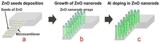 Growth process of Al-doped ZnO nanorods on microcantilever consisting of (a) ZnO seeds deposition; (b) the growth of ZnO nanorods; (c) Al doping in ZnO nanorods using radio frequency sputtering. Modified from Reference [69].
