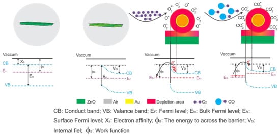 Gas sensing mechanism and energy band of zinc oxide doped before and after CO exposure nanostructures. Modified from Reference [57].