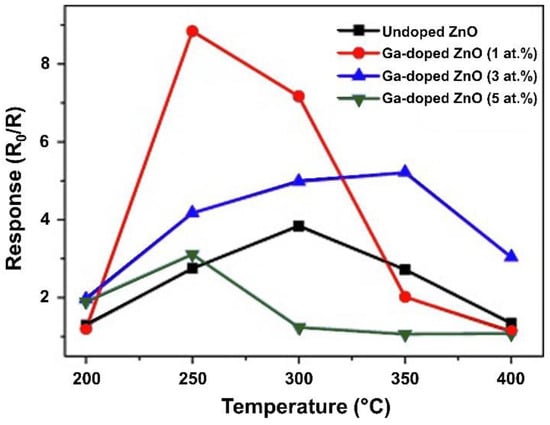 Response to 50 ppm CO of the Ga-doped ZnO nanoparticles as a function of the temperature. Ga concentration of samples correspond at 0, 1, 3 and 5 at. %. Obtained from Reference [77].
