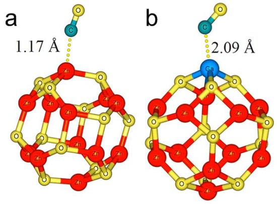 Optimized structures of CO adsorption on undoped Zn12O12 (a) and Ga-doped Zn11O12 (b) clusters. Obtained from Reference [96].