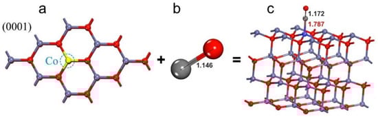 CO adsorption on the Co-doped ZnO (0001) surface. (a) Co-doped ZnO (0001) surface. (b) CO molecule, (c) CO adsorption on the Co-doped ZnO (0001) surface. Note that distances are in Å. Modified from Reference [100].