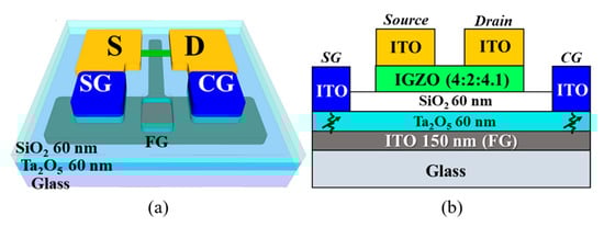 Fully transparent a-IGZO TFTs with embedded RS memories based on a metal–insulator–metal (ITO/Ta2O5/ITO) structure were fabricated on 1 × 1 cm glass substrates (Corning Inc., New York, USA). After performing the standard RCA chemical cleaning process, a bottom FG electrode consisting of a 150-nm-thick ITO conductive film was deposited on a glass substrate using an RF magnetron sputtering system and defined using photolithography and lift-off processes. Subsequently, 60-nm-thick Ta2O5 and 60-nm-thick SiO2 films were deposited sequentially using RF magnetron sputtering to produce the FG insulator. For the channel layer, a 50-nm-thick a-IGZO film was deposited using a sputter target comprising In2O3, Ga2O3, and ZnO in a ratio of 4:2:4.1 mol%. Elemental analysis of the a-IGZO TFT channel was performed by X-ray photoelectron spectroscopy (XPS), in which uniform concentrations of In, Ga, Zn, and O were distributed in the depth direction, and the ratio of In:Ga:Zn was 4:2:4.1. The a-IGZO active channel region, which had a width of 20 μm and a length of 10 μm, was defined via photolithography and wet etching processes. Then, an ITO film with a thickness of 150 nm was deposited before the source/drain (S/D) electrode was formed using the lift-off method. Local etching of the 60 nm thick SiO2 film, which stacked on the 60 nm thick Ta2O5 film, was conducted via a combination of photolithography and wet etching with a buffered oxide etchant (BOE, in a ratio of 30:1) to form contact holes for the CG and SG on the FG, with the Ta2O5 film acting as an RS memory switching layer. After depositing a 150 nm thick ITO conductive film, the CG and SG were formed on the Ta2O5 RS layer via a lift-off process, thereby completing the top electrode (TE) of the embedded RS memory. Additionally, the local contact area of the bottom electrode (BE) of the RS memory was defined using photolithography to create contact holes on the SiO2/Ta2O5 stacked layer on the FG electrode, before being etched via reactive ion etching (RIE).