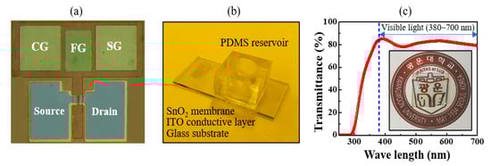 The EG for pH buffer solution detection was prepared by depositing a 300 nm thick ITO conductive film followed by a 50 nm thick SnO2 sensing membrane on a 1.5 × 2.5 cm glass substrate, and then attaching a poly-dimethyl siloxane (PDMS) reservoir to store the pH buffer solution. All the film thicknesses were measured through the DektakXT stylus profilometer (Bruker, Billerica, MA, USA) (not shown thickness data in here). Figure 2a,b show a microscope image and a photograph of the fabricated a-IGZO TFT transducer and the EG, respectively. Figure 2c shows the optical transmittance of the fabricated a-IGZO TFT transducer, which was measured over a wavelength range of 380–700 nm using an Agilent 8453 UV-visible spectrophotometer.