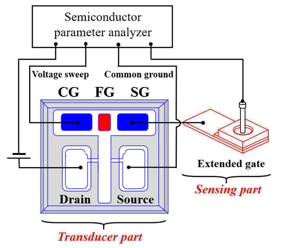 The electrical properties of the constructed sensors were measured using an Agilent 4156B Precision Semiconductor Parameter Analyzer and probe station system in a dark box to exclude illuminance and electrical interference. A commercial Ag/AgCl electrode (Horiba 2080A-06T) consisting of a ceramic–plug junction and an internal solution saturated with KCl and AgCl was utilized as a reference electrode for pH detection. The potential of the pH buffer solution was measured by connecting the a-IGZO TFT transducer and EG directly with an electric wire—the configuration of the electrical measurement system is shown in Figure 3. The sensitivity was determined by measuring the changes in the CG voltage (defined as the reference voltage, VR) at a drain current of 1 nA (defined as the reference current, IR) as a function of the pH value. In addition, the hysteresis and drift voltages were measured to identify the non-ideal behavior of the proposed sensor. The hysteresis voltage width was defined as the difference between the VR of the first and last pH values in the following pH loop sequence: 7 → 10 → 7 → 4 → 7. To evaluate the drift phenomenon, the VR was monitored while exposing the EG to a pH 7 buffer solution for 10 h, with the drift rate defined as the change in VR (ΔVR).