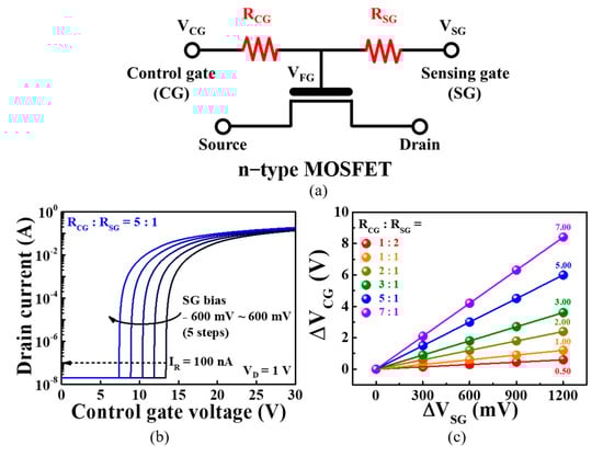 Figure 4 shows the simulation results (performed in PSpice) of the potential for signal amplification using resistive coupling effects, which predicts the electrical properties that may occur during practical measurements in the absence of physical and electrical interference. In addition, by excluding conduction due to unexpected tunneling phenomena, such as Fowler–Nordheim tunneling, the tunneling of conduction band electrons, trap assisted tunneling, direct quantum tunneling, and Schottky tunneling, it is possible to observe the shift of the transfer characteristics (via drain current versus gate voltage curves at a fixed drain voltage) according to the resistance ratio change with accuracy. Figure 4a shows a simplified equivalent circuit for simulating the resistive coupling effect, where VCG and VSG represent the voltages applied to the CG and SG, respectively, and RCG and RSG represent the external resistors connected in series to the CG and SG. The voltage across the FG is resistively coupled to the RCG and RSG, as expressed by Equation (1) (in terms of voltage distribution), while the voltage across the CG is described by Equation (2). Consequently, Equation (3) can be derived, which describes the amplification of the potential modulation across the CG (ΔVCG) owing to the potential across the SG (ΔVSG) at a ratio of RCG/RSG: