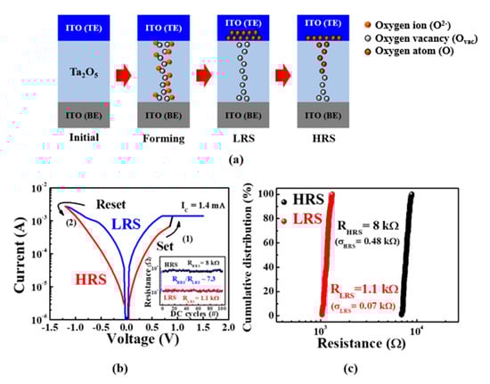 (a) Schematic of formation and rupturing of conductive filaments (CFs) in the Ta2O5 RS layer; (b) BRS I-V characteristics curves of ITO/Ta2O5/ITO RS layer. Inset shows resistance endurance of HRS and LRS at a read voltage (Vread) of 0.2 V; (c) cumulative resistance distribution during 1 × 102 sequential DC cycles.