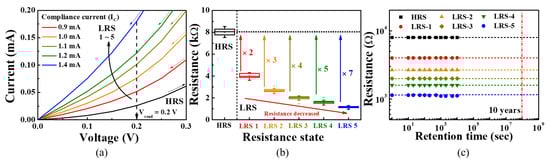 Figure 6 shows the experimental results for the multi-level characteristics of the ITO/Ta2O5/ITO-structured RS memory. The size of the CF can be modified by adjusting the IC, which is often used to control the resistance of the RS layer. As the size of CF increases, the amount of current flowing between the TE and BE increases, thereby enabling multiple LRS levels at the same voltage [,,]. Figure 6a shows the I–V curves as the IC is varied from 0.9 to 1.4 mA in the “set” region where a positive voltage is applied to the TE, which is enlarged around the Vread to distinguish the resistance differences between LRS levels. Depending on the IC, a single HRS and five LRSs were identified, with the resistances of these states extracted using V = IR at the Vread of 0.2 V. To conduct a quantitative comparison and verify the uniformity of the resistance in response to repeated switching, we evaluated the RS operation 30 times for each resistance state as shown in Figure 6b. Figure 6c shows the retention characteristics for non-volatile multiple level resistance over 104 s. The six resistance states do not change for 104 s, providing a stable non-volatile retention characteristic. Table 1 summarizes the average resistance (μ) and standard deviation (σ) of the multi-level resistance states. As the IC increases, the LRS resistances and their standard deviations decrease, indicating that a sensitivity-programmable sensor can be implemented using the resistive coupling of multi-level RCG and RSG resistors.