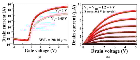 where q, k, T, and Ci represent the unit charge, Boltzmann constant, absolute temperature, and capacitance per unit area, respectively. For the proposed a-IGZO TFT-based transducer, we determined Dit to be 3.48 × 1011 cm−2. For the output characteristic (ID−VD) curves in Figure 7b, the ohmic contact between the a-IGZO channel and the ITO source/drain was identified by the linear increase in ID with VD in the small VD region, while a pinch-off phenomenon, whereby the ID gradually saturates in the large VD region, is also observed.