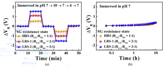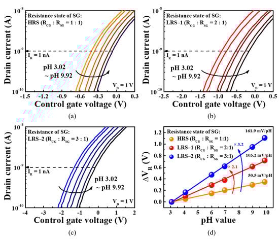 where pHpzc is the pH value with zero free charges and β is the constant representing the chemical sensitivity of the sensing surface []. Thus, the value of ψ depends on the number of ions in the pH solution and the chemical sensitivity of the sensing surface. The sensitivity amplification of the proposed sensor is implemented through the following mechanisms. First, the change in the surface potential (Δψ) of the membrane in the EG unit owing to the change in the pH value of the buffer solution is transferred to the SG electrode of the transducer unit, thereby changing the VSG. Then, the VCG (voltage across the CG electrode) connected in series with the SG electrode via the FG electrode is changed by VSG∙(RCG/RSG) owing to the resistive coupling, as described by Equation (2). As a result, the transfer characteristic curve corresponding to the VCG sweep shifts by RCG/RSG, while the reference voltage (VR) is changed by the same magnitude. Finally, the sensitivity of the proposed sensor is amplified by RCG/RSG. Figure 8a–c show the pH sensing characteristics of the sensitivity-programmable sensors. The resistance states of the RSG were programmed as HRS, LRS-1, and LRS-2, which are chosen as typical resistance states in this study, while the RCG remained as HRS.