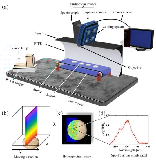 Figure 2a shows a scheme of the hyperspectral imaging setup. The setup is based on a spectrograph (RS 50-1938, inno-spec GmbH, Nürnberg, Germany) connected to a CCD camera (Apogee Alta F47: Compact, inno-spec GmbH, Nürnberg, Germany) with 300 ms integration time. The samples were placed on a conveyor belt moving with speed 0.3 cm/s, which was positioned completely in a tunnel made of PTFE. The purpose of the tunnel design is to have an easily accessible system, which also ensures diffuse illumination of the samples and maintains a reasonable illumination strength and homogeneity. This minimizes an influence of the sample shape and roughness on the spectra. The illumination is provided by a Xenon lamp (XBO, 14 V, 75 W, OSRAM, München, Germany). Figure 2b–d illustrates the principle and workflow of the data acquisition. The continuous line by line collection of spectral information enables a lateral (x, y) 2D image as shown in Figure 2c, whereas each pixel contains a further spectroscopic dimension (λ) as shown in Figure 2d. Thus, a 3D data matrix (hypercube) is recorded.