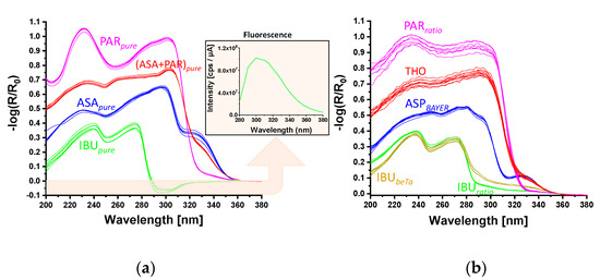 UV total hemispherical reflectance spectra of drug samples in the solid phase in the wavelength range 200–380 nm. (a) API drugs IBUpure, ASApure, PARpure and a mixture of ASApure with PARpure. Upper right: Fluorescence emission of IBU sample with excitation at 270 nm. (b) Painkiller tablets IBUratio, IBUbeTa, ASPratio, PARratio and THO.