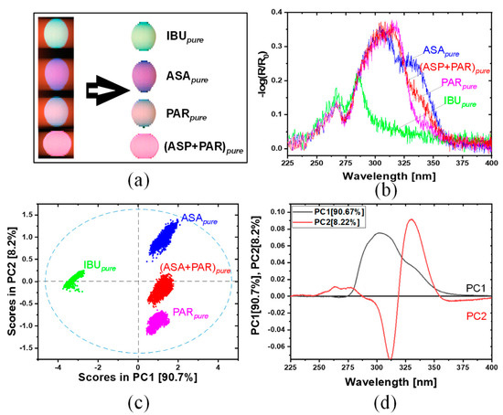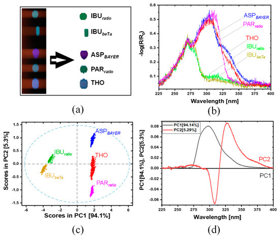 (a) Raw hyperspectral image for all commercial painkiller tablets before and after subtracting the background. (b) Spectrum recorded for a single pixel of each painkiller tablet in the UV range 200–400 nm. (c,d) Scores and corresponding loadings plot.