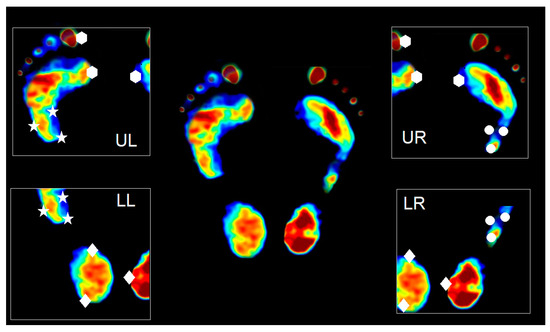 The mosaicking process is used to stitch the multiple images acquired from multiple cameras into one full image. In our system, one foot will be captured by two cameras. As a result, four cameras are used for capturing the two-foot image. The four captured images will be denoted UL, UR, LL, and LR, as shown in Figure 2. To stitch the image, we use the landmark-based technique of image registration [33]. We first stitch UL with LL and UR with LR by manually selecting the landmark, which is also shown in Figure 2 as star and circle landmarks, respectively. With the corresponding landmarks, the geometric transform can be estimated and then used for stitching UL with LL and UR with LR. The process is repeated to stitch the two registered images to derive the full image of two feet shown in the middle of Figure 2.