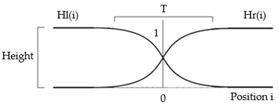 Despite equalizing the intensity and contrast of the captured image, a noticeable junction, appearing as a line, in the stitched image still exists. To resolve this problem, we use two hyperbolic weighted functions, as shown in Figure 3. We denote them as Hr(i) and Hl(i). Before the stitching of the two images, we multiply the horizontal (or vertical) intensity profile of the first image with the Hl(i) and the corresponding horizontal (or vertical) intensity profile of the second image with Hr(i). The addition of the weighted intensity profiles would yield the smoothed transient region in the stitched image.