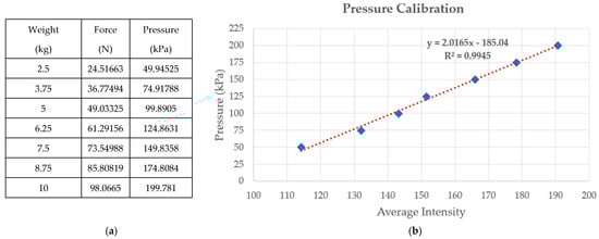 (a) A set of known weights and the associated computed forces and pressures; (b) plot of average intensity and pressure.