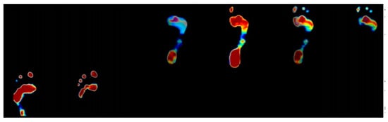 Series of captured images of gaiting foot plantar pressure acquisition. The left side is the plantar pressure when the subject starts to step onto the platform. The middle is the plantar pressure when the subject completely steps on. The right side is the plantar pressure when the subject steps away from the platform.