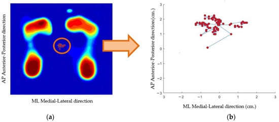 (a) COP trajectory is plotted superimposed with a foot pressure image. (b) COP trajectory is plotted in the 2D coordinate axis.