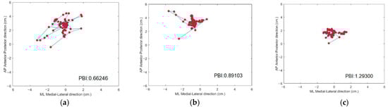 Figure 7 shows the trajectory of the COP among three subjects. The COP trajectory of the first subject, (a) shown in Figure 7a, is scattered, which demonstrates that their human posture balance is weak. In contrast, the COP trajectory of the third subject (c), shown in Figure 7c, is congregated, which demonstrates that subject (c) has good human posture balance.