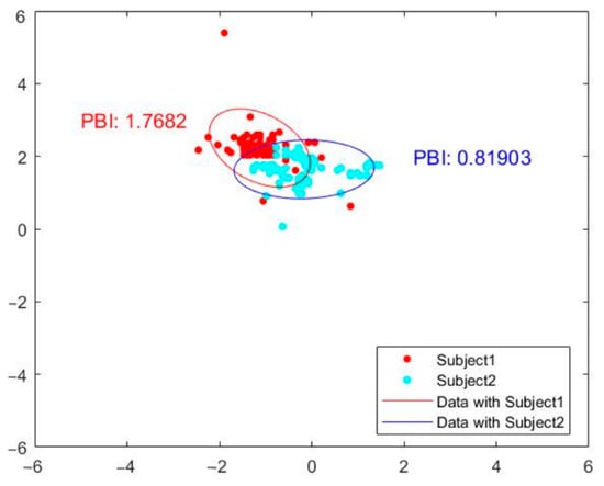 Ellipsoidal fit of COP trajectory labeled with posture balance index of two subjects.