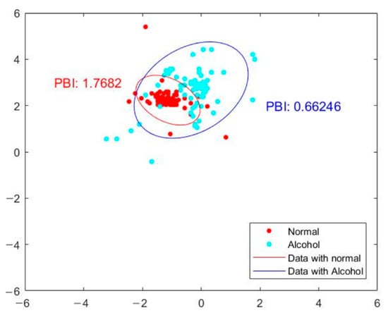 We also demonstrate human posture balance measurement of subjects under various physical conditions—for example, a subject under normal conditions and a subject under the influence of alcohol. The result is shown in Figure 9. In the figure, the ellipsoid fit of the subject under the influence of alcohol is shown in blue. Their PBI is 0.66246. The ellipsoidal fit of the normal control subject is shown by the solid red line. The PBI of the normal subject is 1.7682, which is almost three times that of the subject under the influence of alcohol. In summary, the subject under the influence of alcohol displays a poorer posture balance index than the normal subject. Our proposed optical-based plantar pressure measurement system is hence capable of performing static foot plantar pressure evaluation (human postural balance) for subjects under various physical conditions.