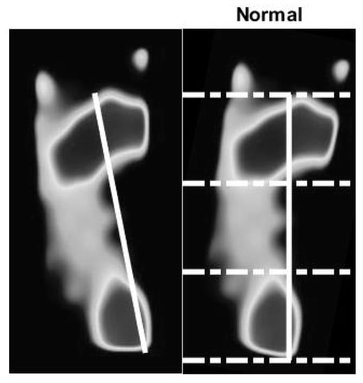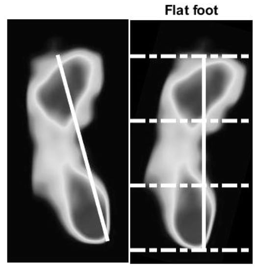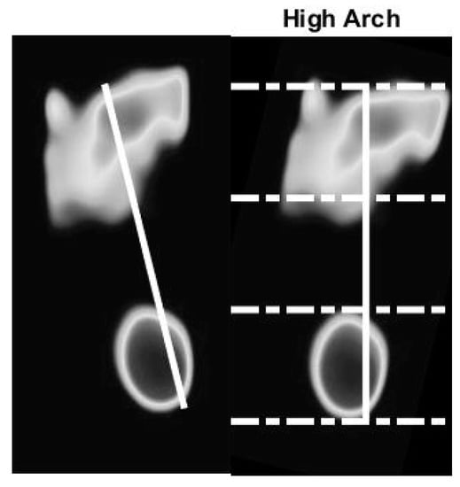 The flat foot has an arch index ≥0.26, the normal foot has an arch index between 0.21 and 0.26, and a high arch foot has an arch index ≤0.21 [36]. All subjects (N = 90) usually stand barefoot or while wearing socks on the platform for a moment. The footprint image is collected by this system. The essential parameter is then calculated and further used to classify the foot type. A sample of results of the static pressure measurement evaluation is shown in Figure 10, Figure 11 and Figure 12 for normal foot, flat foot, and high arch foot, respectively. It shows a sample of different foot types. In the figure, solid lines represent the principal axis, while dashed lines equally divide the principal axis and hence the foot plantar pressure into three equal spaces. Then, the arch index can be computed using Equation (1). The arch index for plantar pressure in Figure 10, Figure 11 and Figure 12 is 0.23, 0.31, and 0.16, respectively. The arch index will be used as one of the static features for person identification and/or recognition.