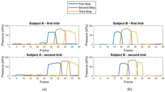 The gaiting plantar pressure represents pressure variation used to analyze the subject’s walking pattern. We tested the gaiting plantar pressure acquisition with the subjects shown in Table 1. Figure 13a shows the pressure variation over a period of time from three steps in one subject. Figure 13b shows pressure variation over a period of time from another subject. The upper and lower graph present the pressure variation over a period of time in two gaits. The three traces in each graph are the pressure variation graphs for each step. Evidently, the upper and lower graph in Figure 13a,b show similarity in the pressure variation graph for the same subject, and this can be later used for gait biometrics. To measure the similarity of the pressure variation graph, the correlation coefficient [37] can be used. The coefficient value is between 1 and −1. A value close to one demonstrates high similarity between the two graphs.