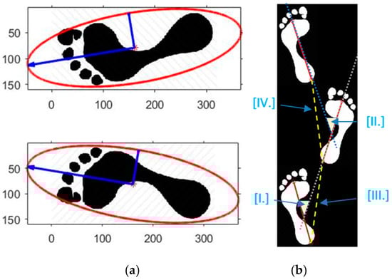 Illustration of the static (a) and dynamic feature (b). In (a), blue vectors are the two-principal axis, the red is the ellipsoidal fit; in (b), step angle (III–IV) is the angle between the principal axes of the left and the right foot. Step width (I–II) is defined to be the distance between each step of the subject.