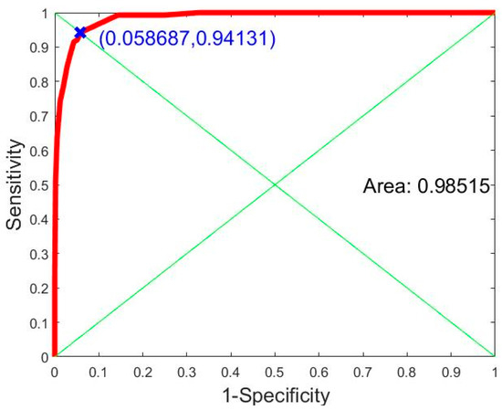 The x-axis of the ROC curve shows specificity (false match rate) and the y-axis shows sensitivity (true match rate). These points on the ROC curve represent the specificity and sensitivity of the threshold in the histogram distribution. The area under the ROC curve is 0.98515 (98.515%). This can be used to measure the recognition rate or efficiency of the system for person identification. Another indicator used in person identification is the equal error rate (EER) [38], the point on the ROC curve at which the true match rate and false match rate are equal. This point is obtained by intersecting the ROC curve with a diagonal of the unit square. According to the ROC curve in Figure 16, our plantar pressure biometric system can achieve an EER of 5.8687%.