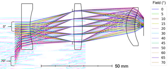 Optical design of the LW camera. The total axial length equals 86.12 mm. The system consists of 3 singlet lenses. The aperture stop is situated between the first two lenses. The circular image on the detector has a radius of 6.528 mm. The different colors correspond to the different fields between 0° and 70°.