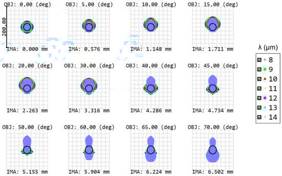 Spot sizes for fields between 0° and 70°, for all wavelengths between 8 and 14 µm (as visualized by the different colors in each spot plot). The Airy disk radii (black circles) equal 17.28 µm. Based on the spots, the system shows a good image quality. OBJ (in degrees) defines the object field and IMA (in mm) defines the image height of the centroid on the detector. This figure indicates that the best performance is obtained on-axis, while off-axis spots show less favorable performance.