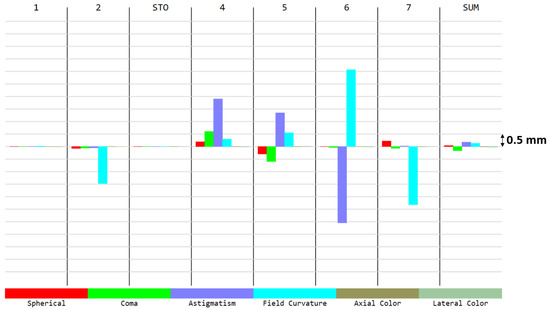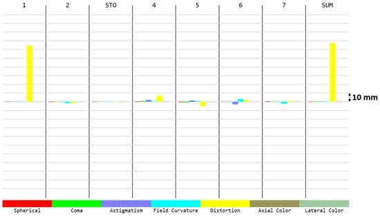 Five Seidel aberrations and (axial and lateral) chromatic aberrations. The aberrations are given for each surface involved in the optical system (1 and 2 for the first lens, 3 = STO i.e., the stop aperture, 4 and 5 for the second lens, 6 and 7 for the third lens). The SUM represents the sum of these aberrations at the image plane. The main aberration is the barrel distortion, mainly induced by Surface 1, i.e., the front surface of the first lens. The barrel distortion is further detailed in Figure 5. The same aberration contributions were observed for all wavelengths between 8 and 14 µm.