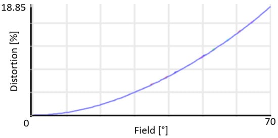 To better understand the contributions for each aberration present in the spot diagram (Figure 2), we can have a look at the Seidel diagram (Figure 3 and Figure 4), which quantifies the common aberrations in the optical system (spherical, coma, astigmatism, field curvature, distortion, axial color, lateral color) []. Distortion generally increases with the field, and therefore it is a common aberration in WFOV imaging systems. The front surface of the first lens contributes the most to distortion. However, there is no particular requirement on this aberration since it can be measured during pre-flight characterization and can be taken into account during the in-flight processing. When considering all aberrations except distortion, positive aberrations of one lens surface are compensated by negative aberrations of another lens, minimizing the total aberrations at the detector (Figure 3). Consequently, barrel distortion remains the main aberration at the detector (Figure 4). A quantitative view on the barrel distortion is given in Figure 5, showing that distortion is maximal at 70°, where it equals 18.85%.