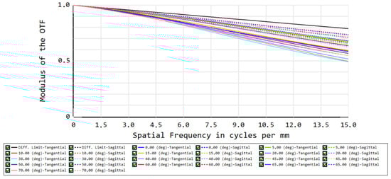 MTF ≥ 0.5 at 15 cycles/mm. The top black line corresponds to the diffraction limit, and the colors correspond to the different fields, similar to those in Figure 1. Full lines and dashed lines correspond to tangential and sagittal planes, respectively.