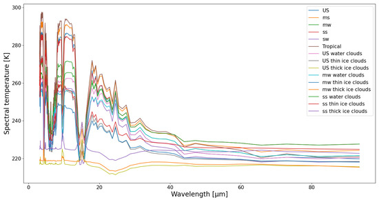 For each of the 15 scenes, the spectral brightness temperatures are generated in the wavelength range from 3 µm to 100 µm (Figure 8).