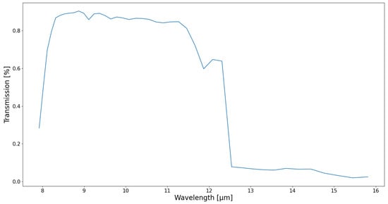 For each scene, the narrowband temperature can be computed by applying a similar method to the simulated filtered spectral irradiances, by using Equations (5)–(9). The narrowband irradiance is defined as the integral over the wavelengths of the filtered spectral irradiances , which are the product of the spectral irradiances by the spectral response SR(). The spectral response SR() takes into account the transmission of the optical system, i.e., the transmission of the germanium material, and the spectral response of the detector (Figure 9).
