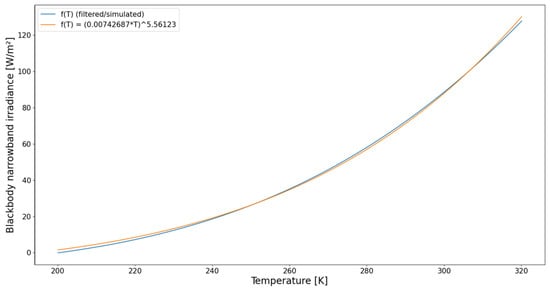 Blackbody narrowband irradiance as function of the blackbody temperature: blue curve = f(T) (filtered/simulated), orange curve = analytical fit.