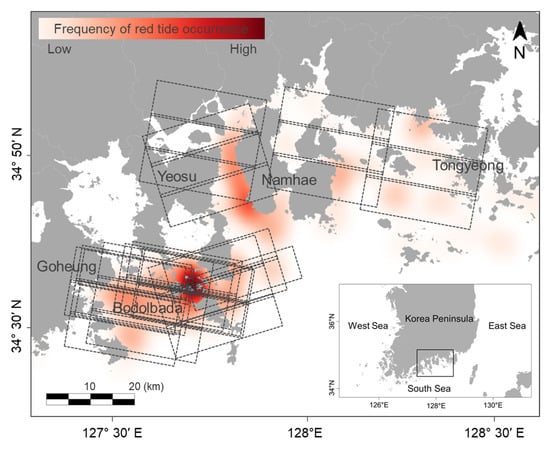 Margalefidinium polykrikoides blooms occur in Korean coastal waters in a repetitive manner. This type of bloom has gradually become larger, wider, and more frequent since first appearing in 1995 [1,2]. M. polykrikoides blooms with a cell abundance greater than 1000 cells mL−1 can have a negative impact on fish or shellfish [3]. Large-scale M. polykrikoides blooms first formoffshore and are then generally transported to coastal waters, where they gradually accumulate [4]. Because there are many aquaculture cages found along the south coast of Korea, The occurrence of blooms with a high cell abundance in this area would cause considerable economic damage. Since the outbreak of red tide blooms in 2015, M. polykrikoides blooms have not occurred on a large scale (maximum cell abundance >20,000 cell mL−1 and duration >40 days) [4] between 2016 and 2020. Nevertheless, M. polykrikoides blooms with a cell abundance of over 1000 cells mL−1 have occurred on the southern coast of Korea every year from 2016 to 2020. To mitigate the damage caused by red tide blooms, it is important to identify their spatial distribution. Daily red tide reports provided by the National Institute of Fisheries Science (NIFS) include many types of data, including the nature of the causative organisms, cell abundance, and affected and warning areas [5]. NIFS operates a red tide warning system to provide red tide information through field sampling at discrete locations, focusing on M. polykrikoides. This system is composed of four levels: red tide emergence notice (>10 cells mL−1), red tide notice (>100 cells mL−1), red tide alert (>1000 cells mL−1), and warning lift. If the red tide observation areas are very wide, field sampling based on discrete locations is limited in terms of manpower, cost, and time. Hence, remote sensing approaches for red tide monitoring can be an effective tool and can overcome the spatial and temporal limitations of field sampling.