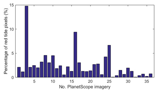 Figure 6 shows the histograms and their statistical properties of non-red tide and red tide pixels determined by RTI calculated from the wavelength bands of a PlanetScope image acquired on 29 July 2018 at 01:42 GMT, where 10,000 pixels were selected randomly from the non-red tide and red tide pixel groups. As shown in Figure 6a, the RTI histograms of both groups showed a symmetrical bell-shaped distribution. Figure 6b shows the RTI values for both groups. The RTIs in both groups were distributed in a similar range. The minimum RTI of the non-red tide group was larger than that of the red tide group, whereas the opposite was true for the maximum RTI. Both groups showed similar mean and median RTI values. From the overlapped histograms and their similar statistics for both groups, we concluded that RTI was not sufficient to distinguish between red tide and non-red tide pixels via a threshold. Figure 7 shows the RTI thresholds determined by the median RTI values of the red tide group for 36 PlanetScope images. We recognized the red tide areas when the RTI value was above the threshold determined for each image.