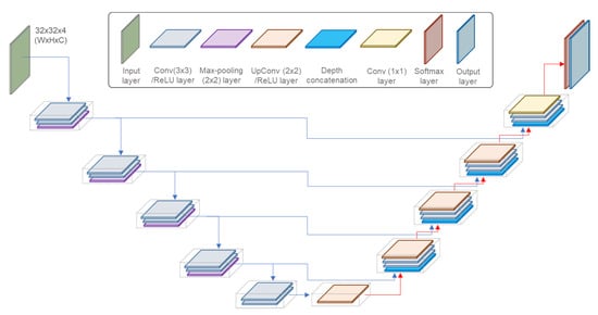 U-Net was trained to classify four spectral bands of each pixel in 32 × 32 PlanetScope patches to two labels of zero and one, corresponding to non-red tide and red tide, respectively. Here, U-Net was constructed with five convolutional layers and five deconvolutional layers to extract spectral features related to red tide waters from the four wavelength bands of the PlanetScope images. As shown in Figure 3, the encoder block is down from the top to the bottom layers on the left to extract from coarse to fine features. The extracted features pass through the decoder block from the bottom to the upper layers on the right side. The kernel size and number of convolutional layers at the encoder and decoder blocks are summarized in Table 3. We added a dropout layer in the end of the encoder block. The softmax and output layers determine whether each pixel is related to a red tide. The loss function (L) consist of a cross-entropy (LCE) and L2 regularization (L2) functions with a hyper-parameter (λ), as defined in Equations (1) and (2) [51]. In Equation (2), tij and yij are the indicators and the softmax output for the i-th sample and the j-th label, respectively. N and K are the number of samples and labels, respectively.