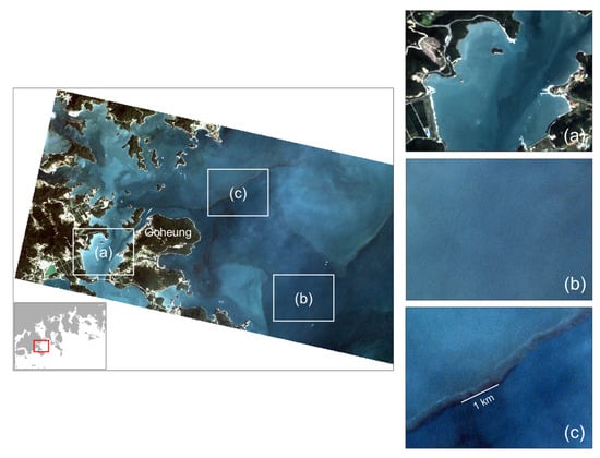 3B surface reflectance (SR) PlanetScope true-color composite image (R: 630 nm; G: 545 nm, B: 485 nm) acquired near the coast of Goheung on 29 July 2018 at 01:42 GMT. Selected regions, (a–c) in the left image are enlarged on the right panels. Regions (a–c) represent turbid, the surrounding, and red tide waters, respectively. Region (c) shows a high-density M. polykrikoides strip in brown appearing along the coast of Goheung (2500 cells mL−1).