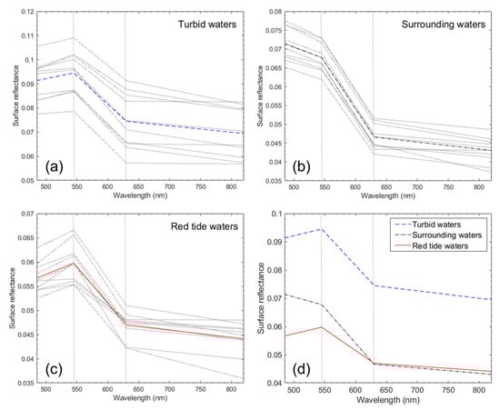 Spectra of (a) turbid waters, (b) the surrounding water, (c) red tide waters, and (d) the average spectra of three water types in the coast of Goheung from 3B SR PlanetScope image on 29 July 2018 at 01:42 GMT. For spectra extraction of the three water types, pixels were randomly selected from the regions in Figure 3a–c. Blue dashed, black dash-dot, and red lines indicate the average over the extracted spectra in (a–c), respectively.