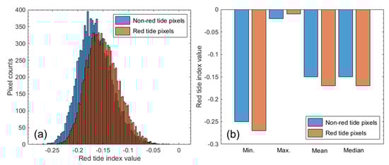 (a) Histograms of red tide index (RTI) values in relation to 10,000 non-red tide pixels and 10,000 red tide pixels in a PlanetScope image acquired on 29 July 2018 01:42 GMT near the coast of Goheung. (b) The statistics calculated from RTI distribution of randomly-selected pixels of each group. Min. and Max. are minimum and maximum values, respectively.